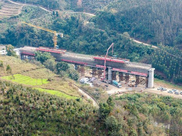据悉,连篆1号特大桥连续梁开工后,黄百铁路广西段桥梁工程设计的21联连续梁已有13联进入施工阶段,占比超60%,桥梁上部工程施工已全面铺开。截至目前,黄百铁路广西段新建隧道33座已有7座实现安全贯通,隧道、桥梁、路基工程分别完成设计总量的45.6%、50.7%、43.6%,工程建设稳步推进。