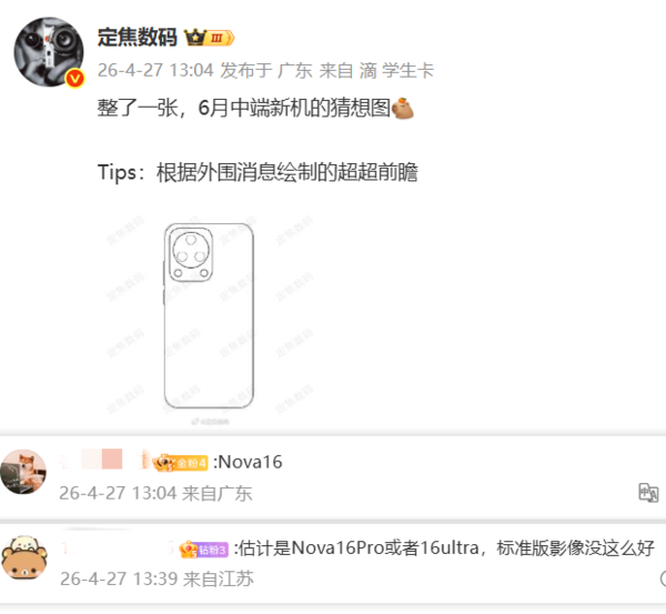 从猜想图来看,这款新机的背面摄像头模组采用"方中带圆"的设计,共有五个圆形开孔,外层嵌入方形矩阵底座,巧妙地融合了几何美学与实用功能,视觉辨识度极高。机身侧面则配备了音量键和电源键。值得一提的是,在评论区中,多位网友表示这款新机可能是华为nova 16系列。